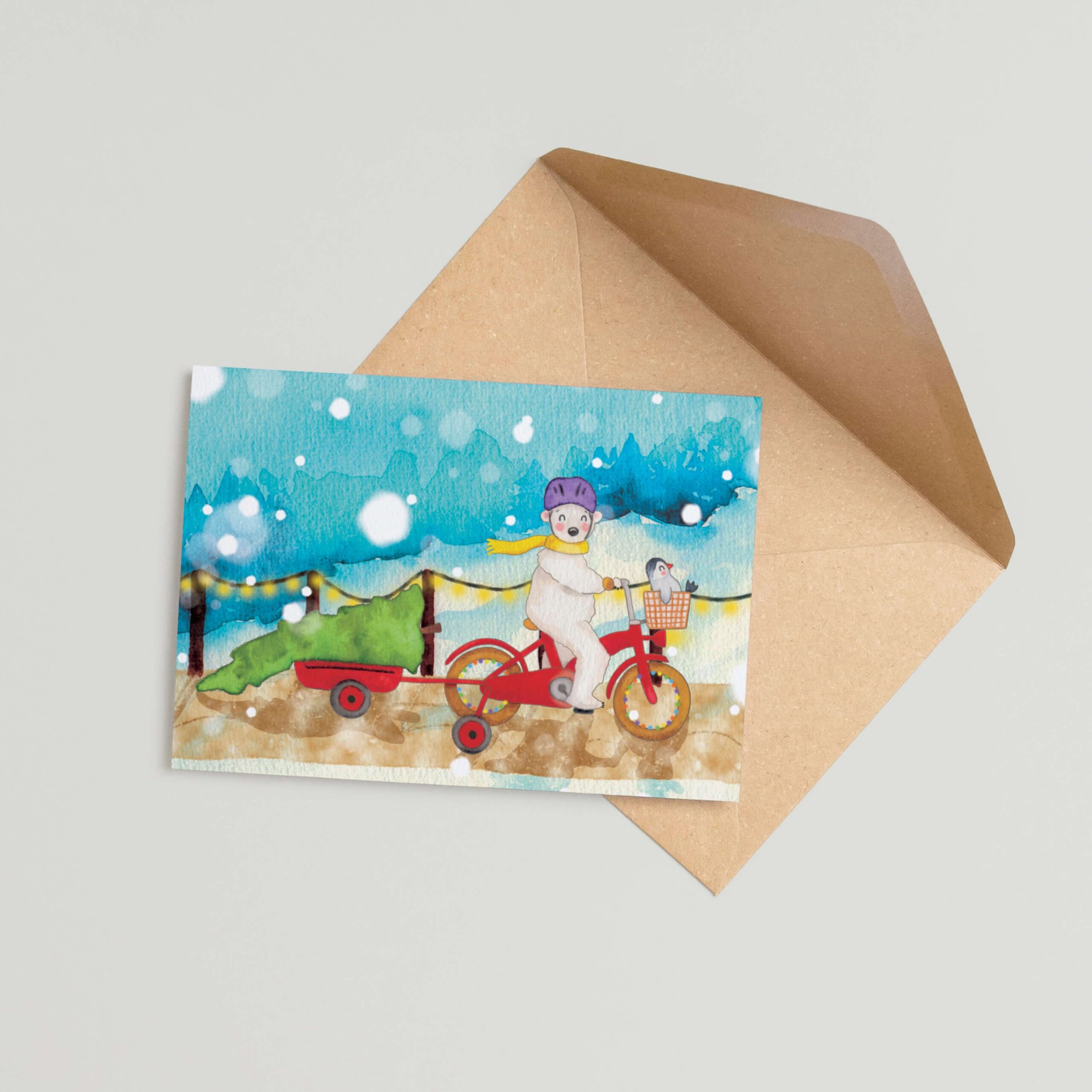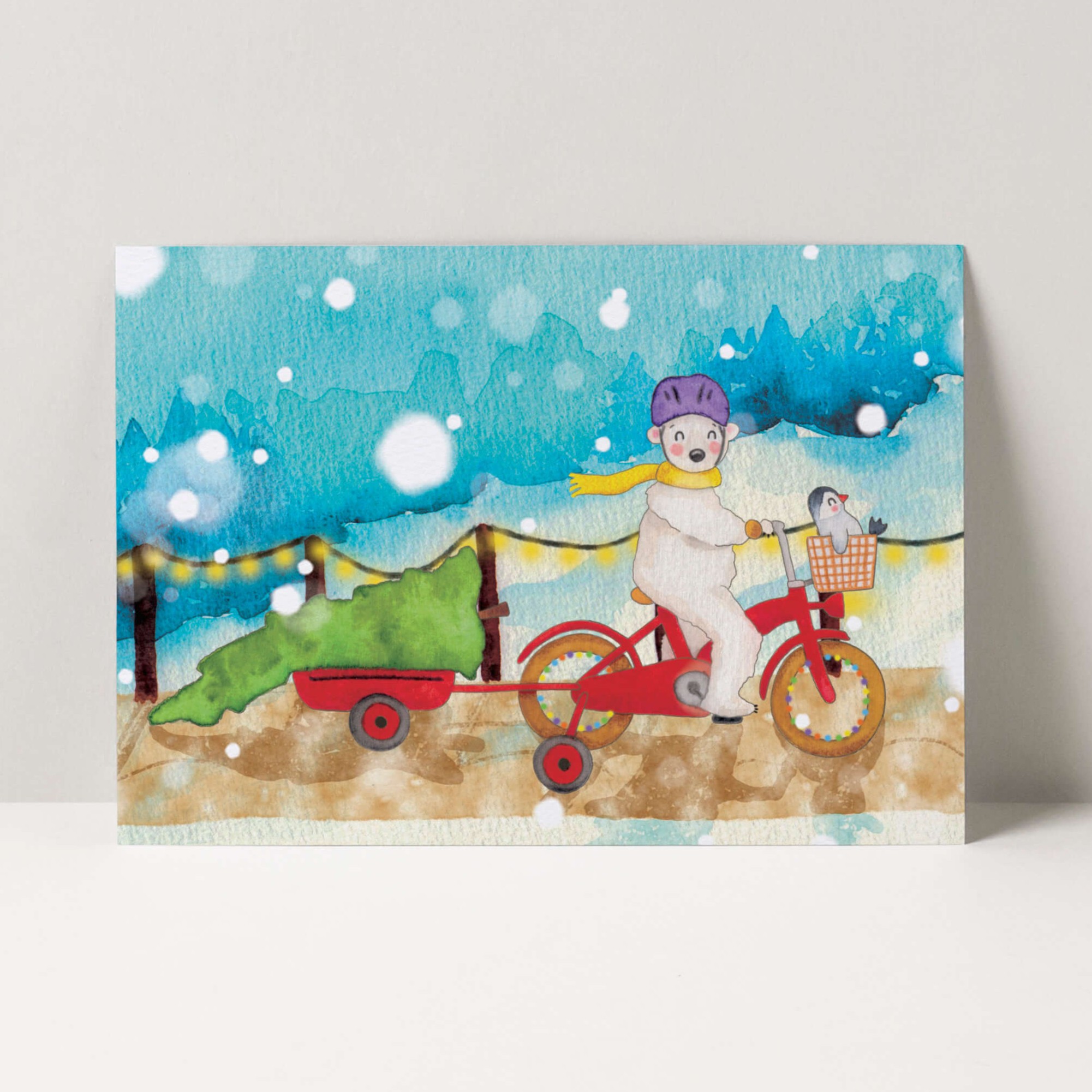 Een handgetekend kleurrijk kerstkaartje van een ijsbeer en pinguïn die samen in de sneeuw op pad gaan; het is weer tijd om een kerstboom te gaan halen. Achter op de fiets hangt een aanhangertje met een kerstboom erin en voorin het mandje zit een kleine pinguïn die vrolijk mee geniet. Samen gaan ze een heerlijke kerst tegemoet.