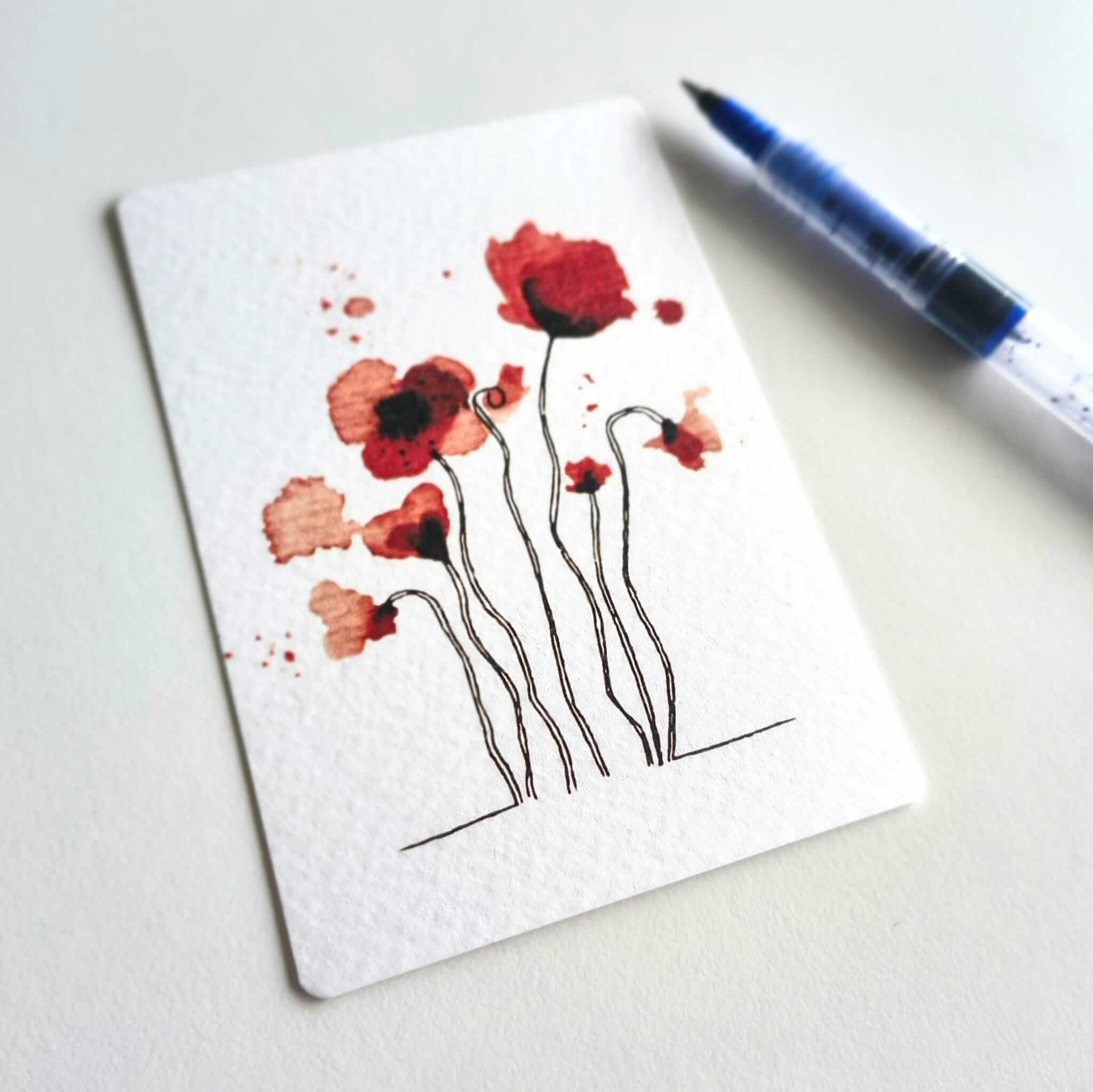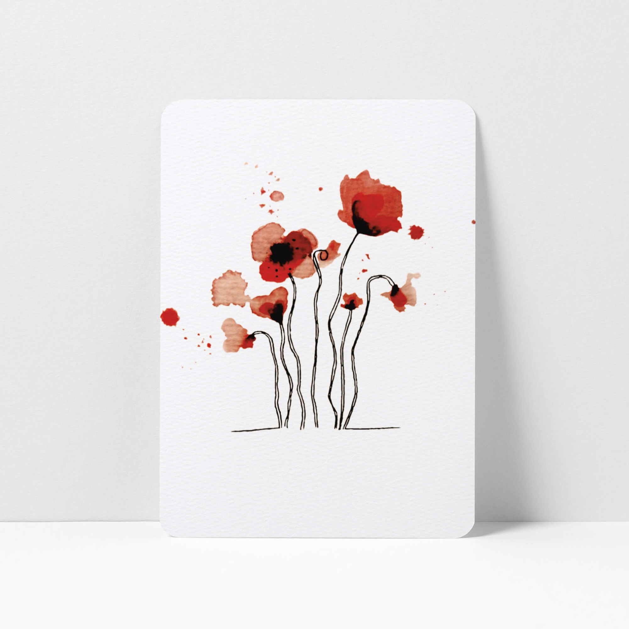 Een minikaartje met bloemen is altijd een goede keuze om iemand te laten weten dat je aan diegene denkt. Dit minikaartje toont een handgetekende illustratie van enkele klaprozen in aquarel en straalt rust uit.