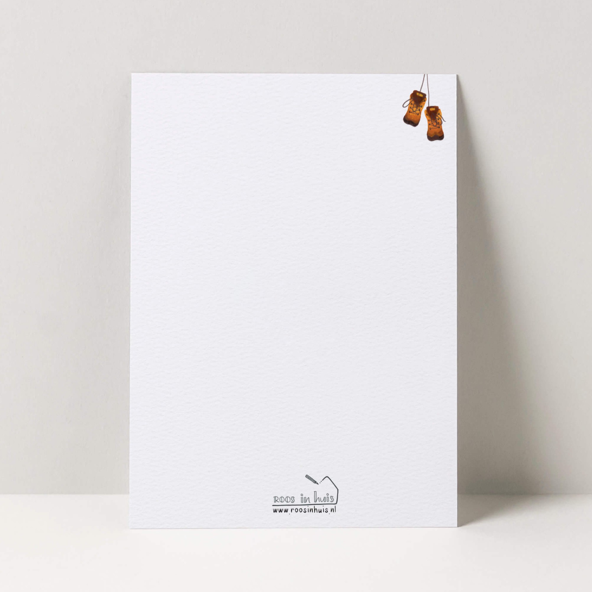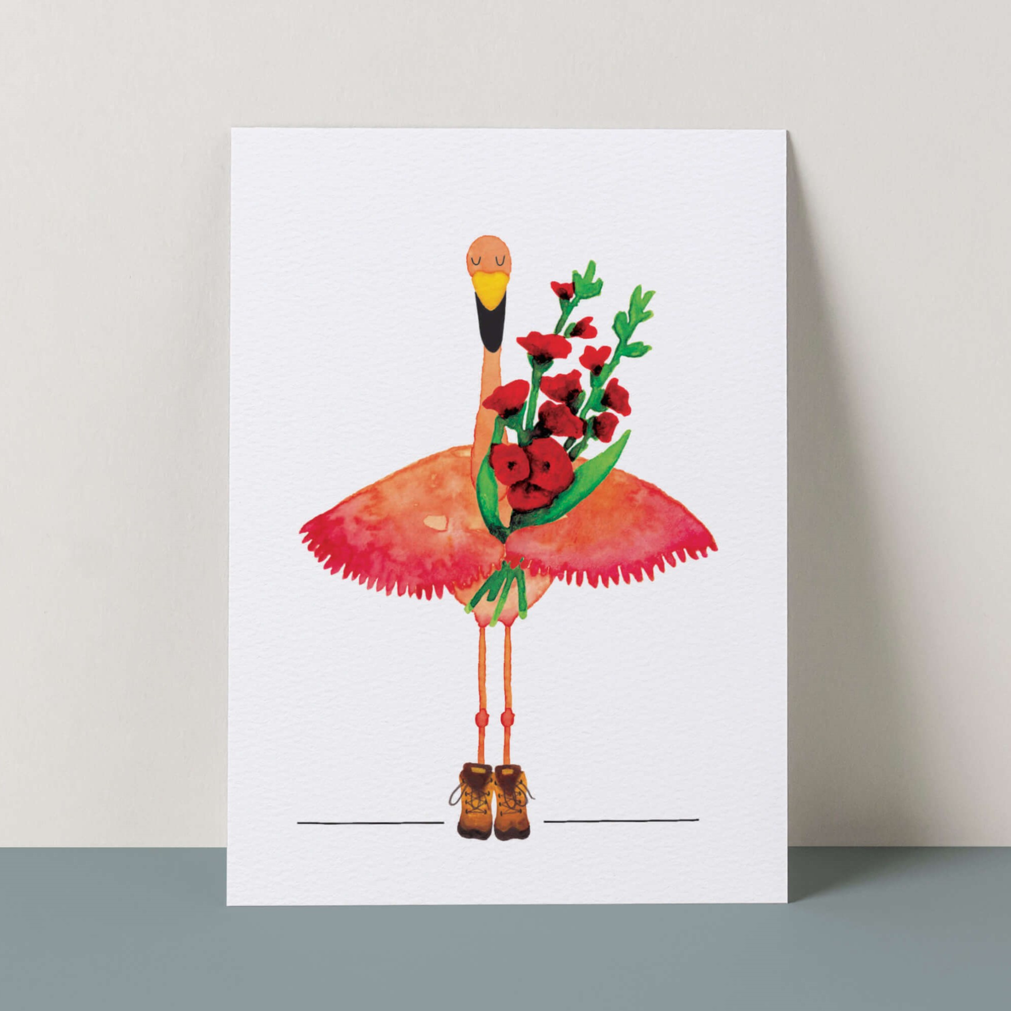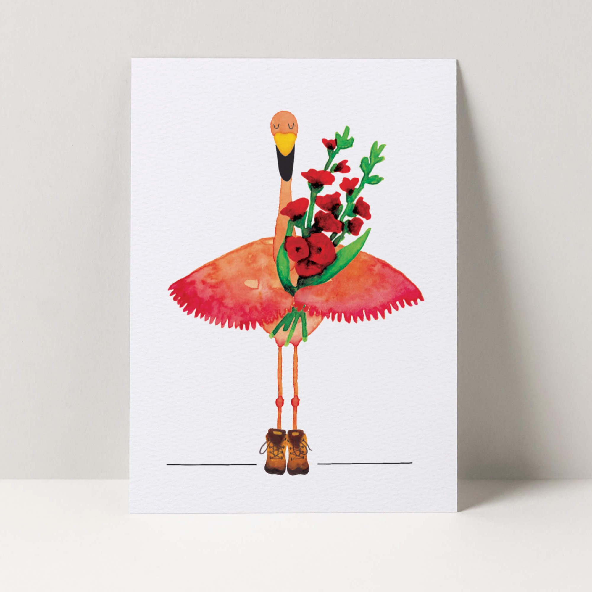 Een flamingo op wandelschoenen? Jazeker! Deze vrolijke Vierdaagse kaart brengt een glimlach op elk gezicht. De flamingo draagt met trots een bos gladiolen – hét symbool van de Nijmeegse 4daagse.