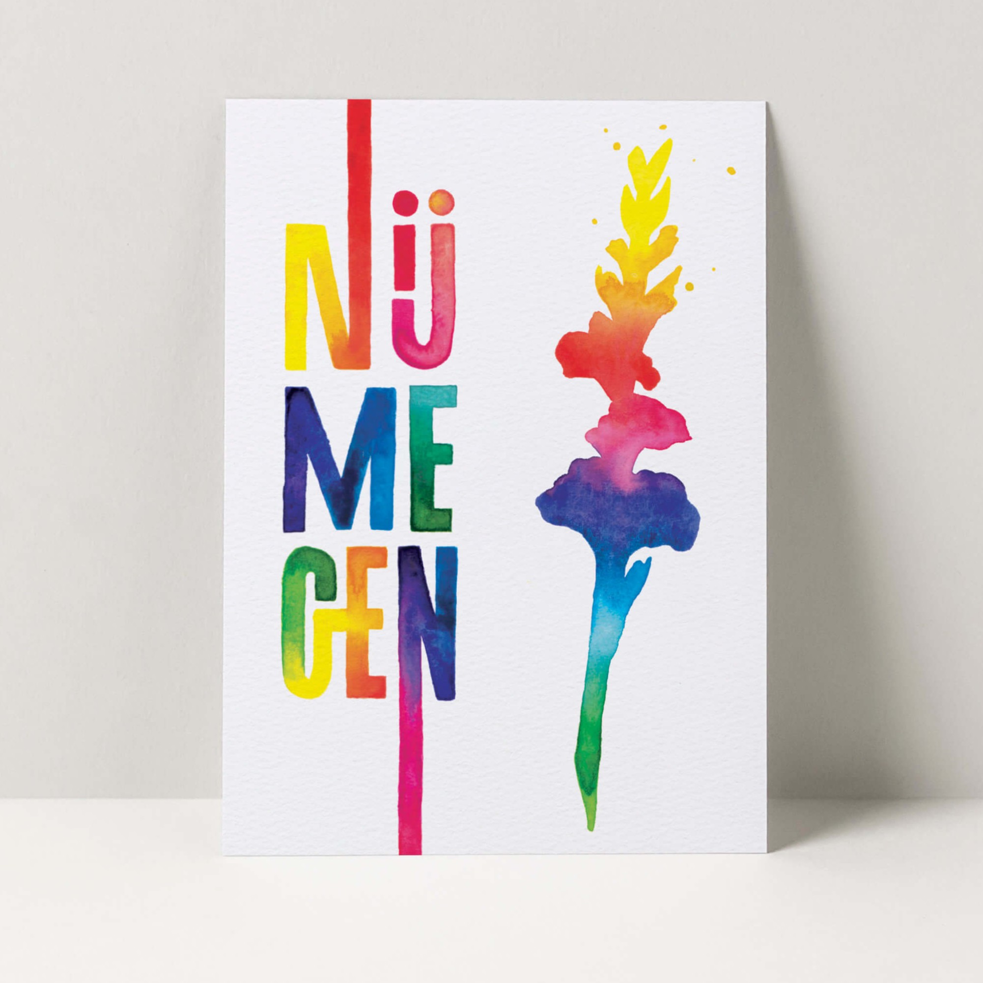 Verras iemand met een Vierdaagse kaart Nijmegen met gladiolen in regenboogkleuren! Op deze kleurrijke kaart staat een handgetekende illustratie van de iconische gladiool, het symbool van de Nijmeegse 4daagse. Of je nu iemand succes wilt wensen of wilt binnenhalen, deze felicitatiekaart Vierdaagse Nijmegen is een persoonlijk en blijvend gebaar.