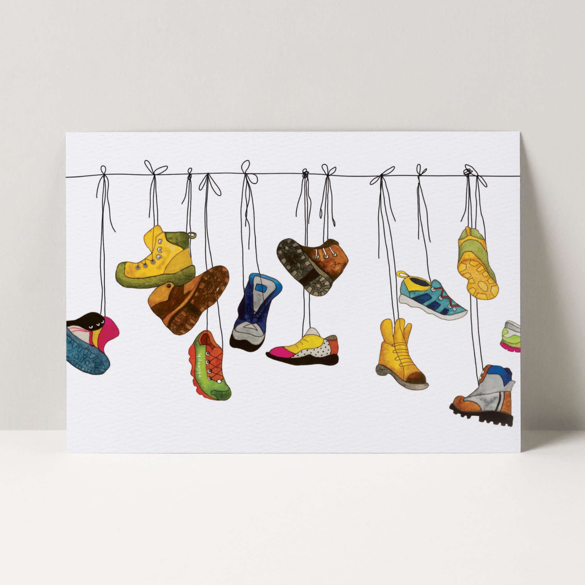 Deze Vierdaagse kaart zegt alles zonder veel woorden: de wandelschoenen bungelen aan de lijn, de Nijmeegse 4daagse zit erop. Een iconisch gebaar, maar oh zo waar! Een perfecte kaart om iemand te feliciteren met het uitlopen van de Nijmeegse 4daagse. Een originele Vierdaagse verrassing én blijvend aandenken.