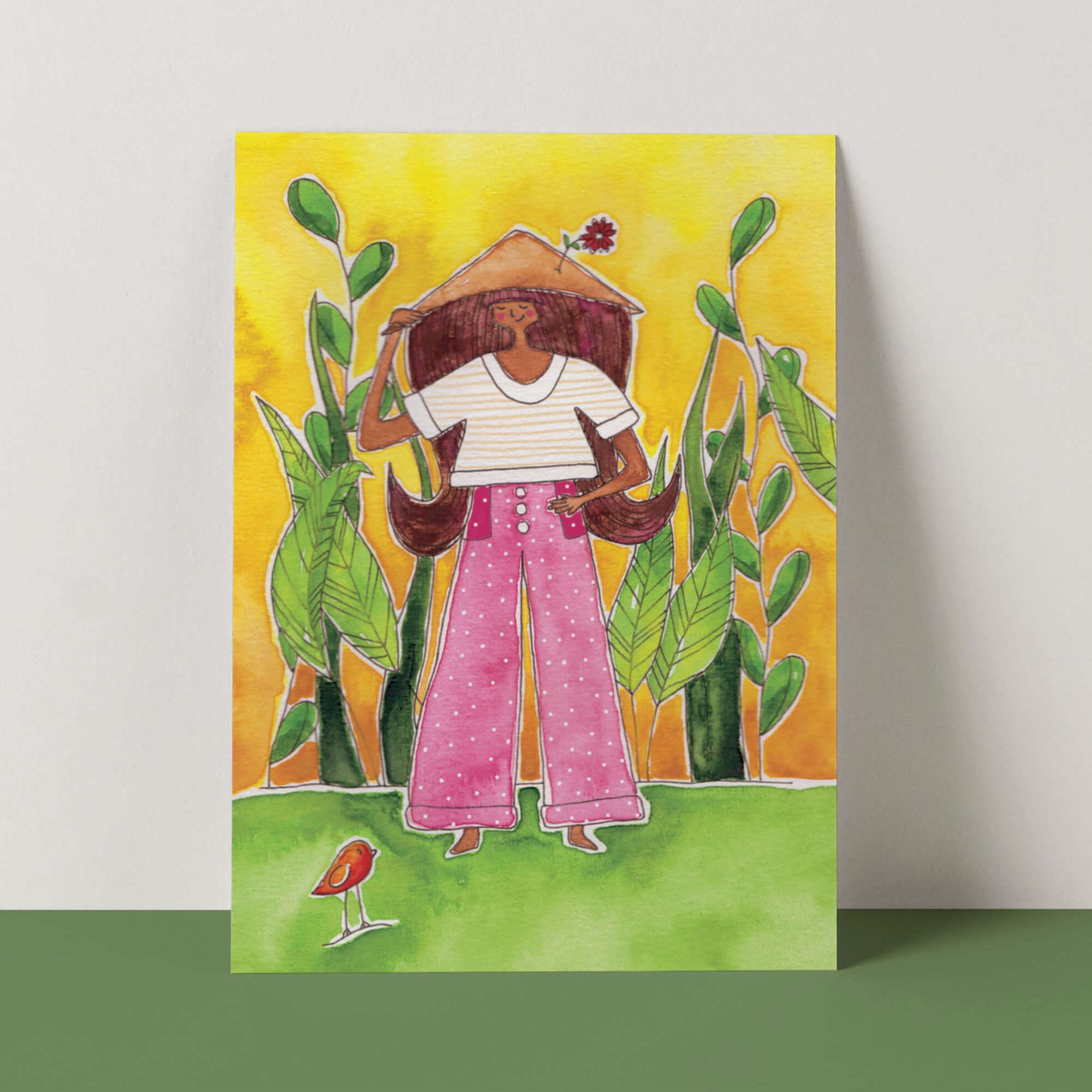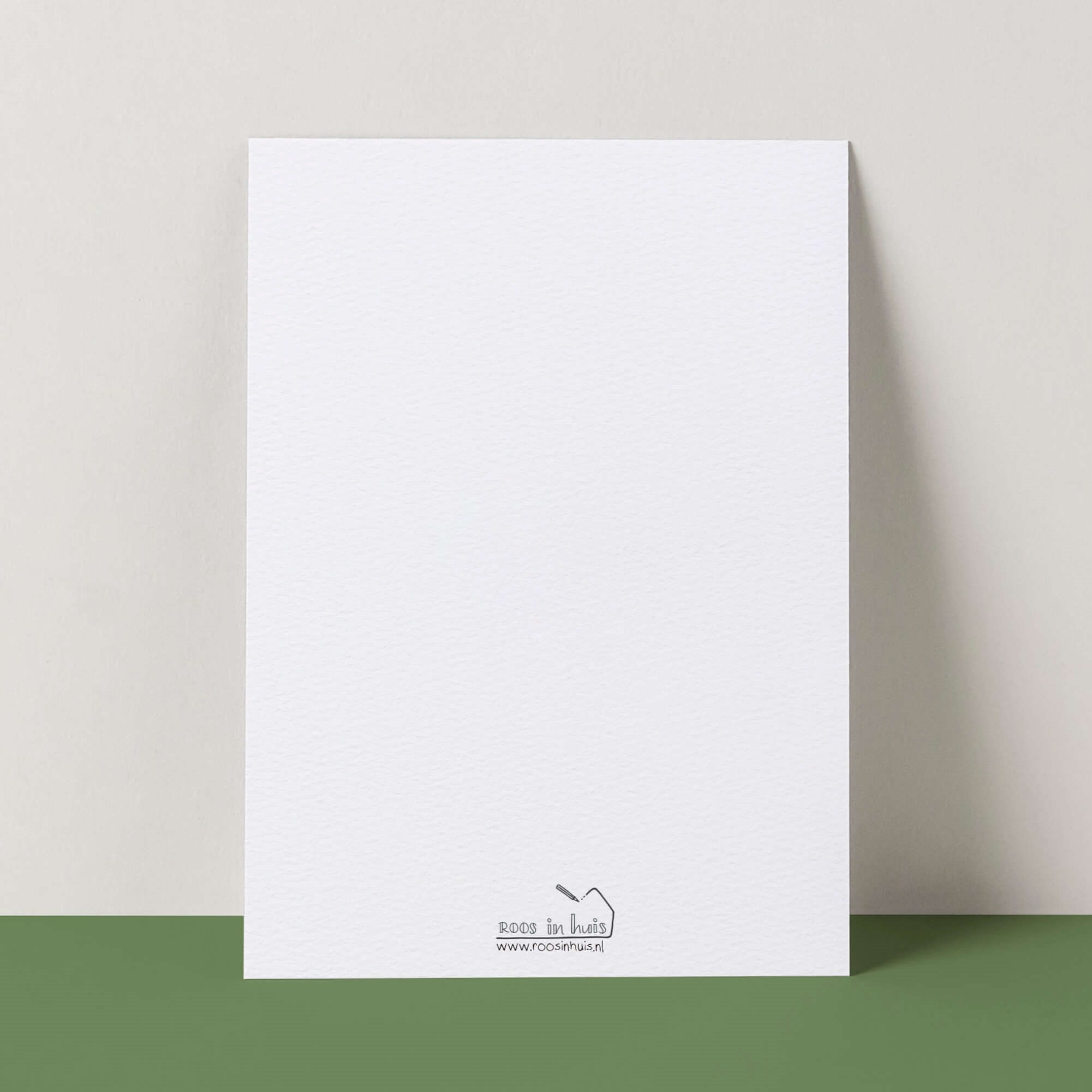 Gemaakt met aquarel en kleurpotlood. Het betreft een A6 formaat (14,8 cm x 10,5 cm) met een blanco achterkant.