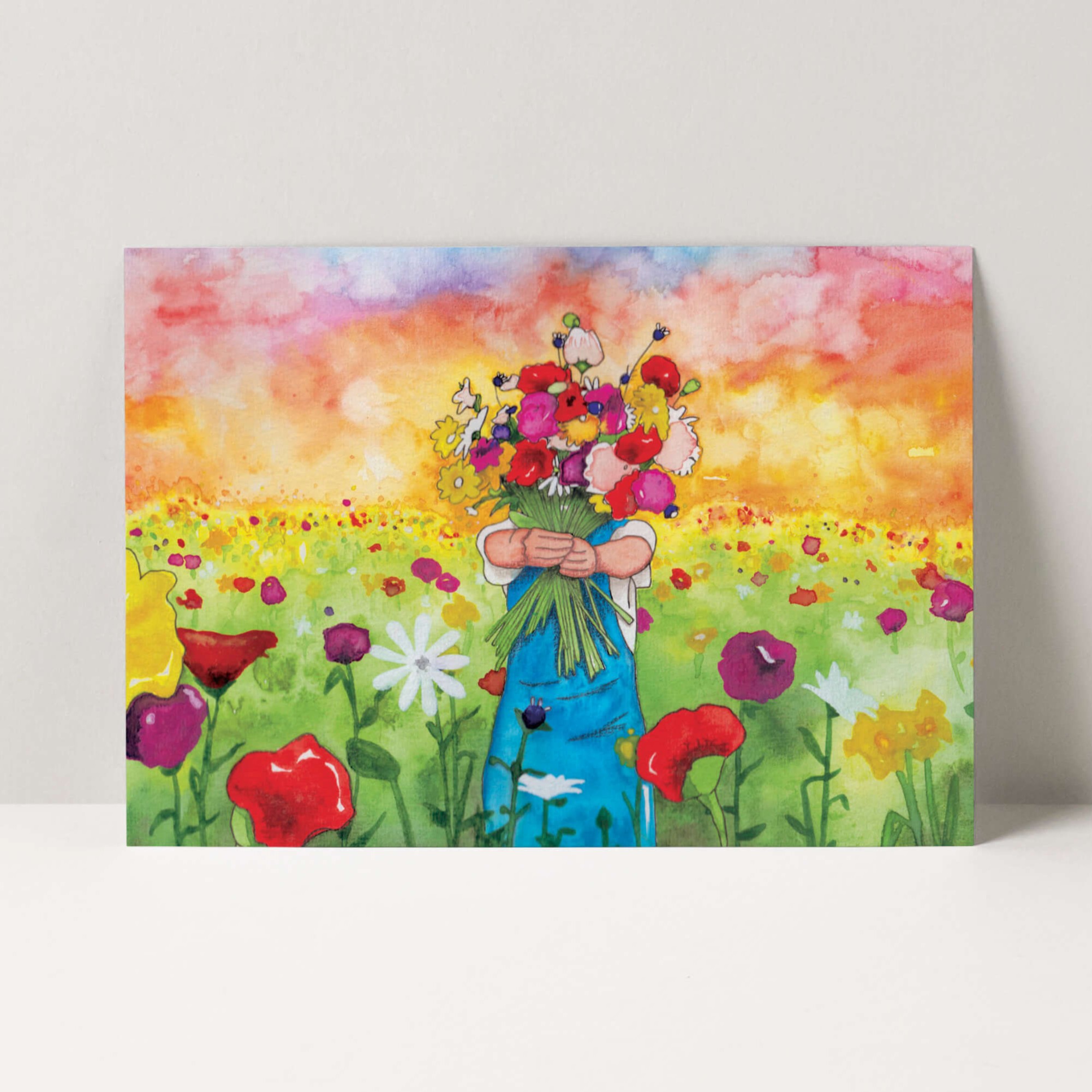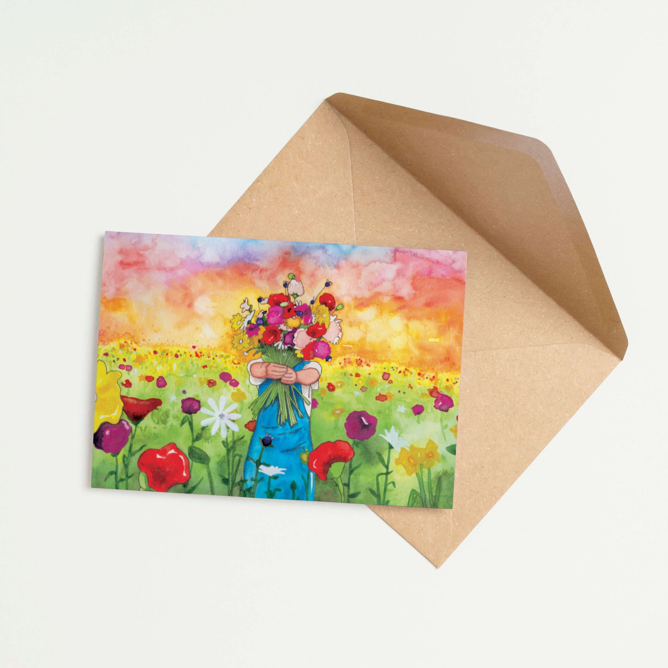 Een kaart met bloemen is altijd een goede keuze om iemand op te vrolijken, te feliciteren of zomaar een lief gebaar te maken, laat staan als het een uit het wild geplukte bos bloemen is! Deze wenskaart toont een handgetekende illustratie van een kleurrijk bloemenveld. Het is een liefdevolle kaart met bloemen waarmee je iemand warme lente- en zomer gevoelens stuurt.