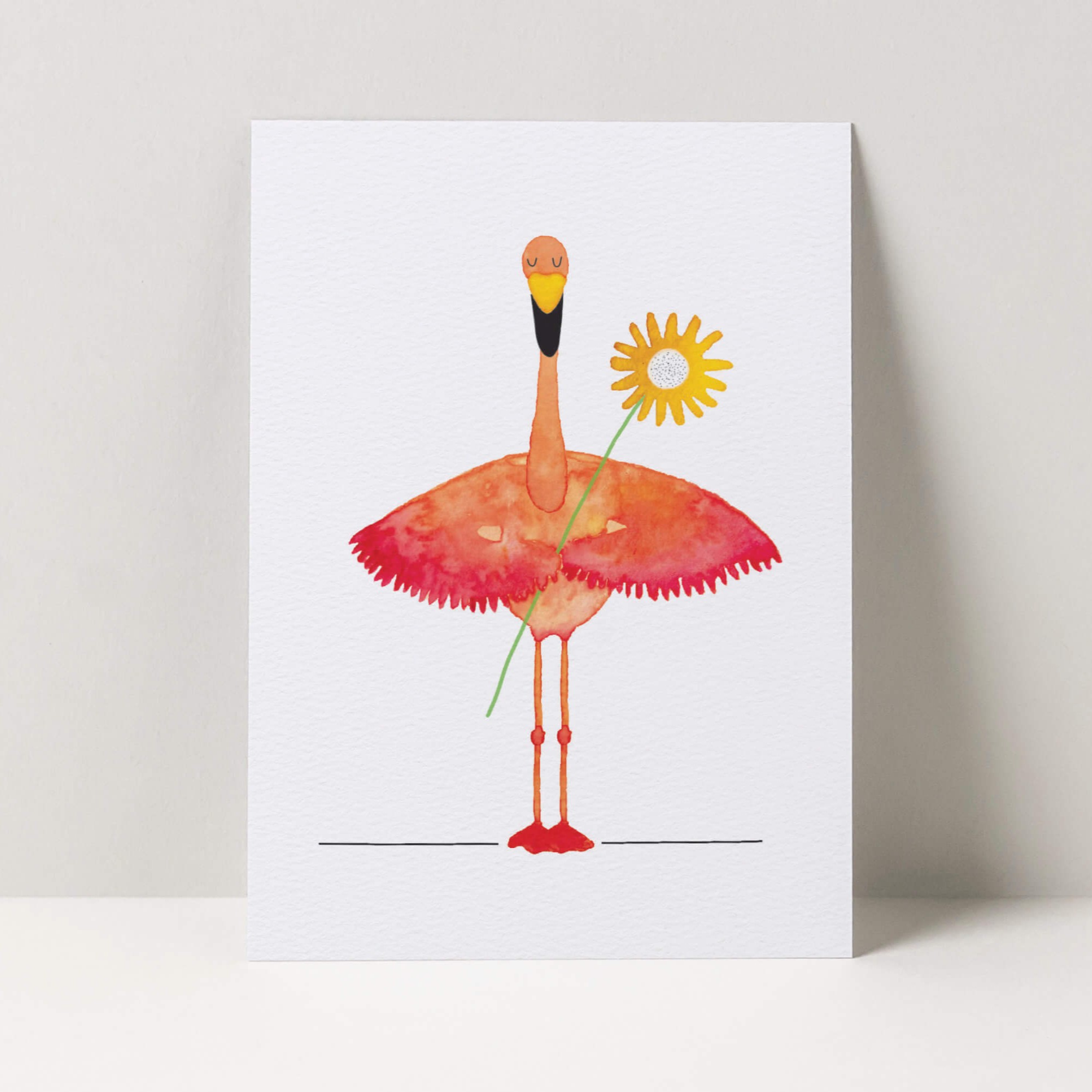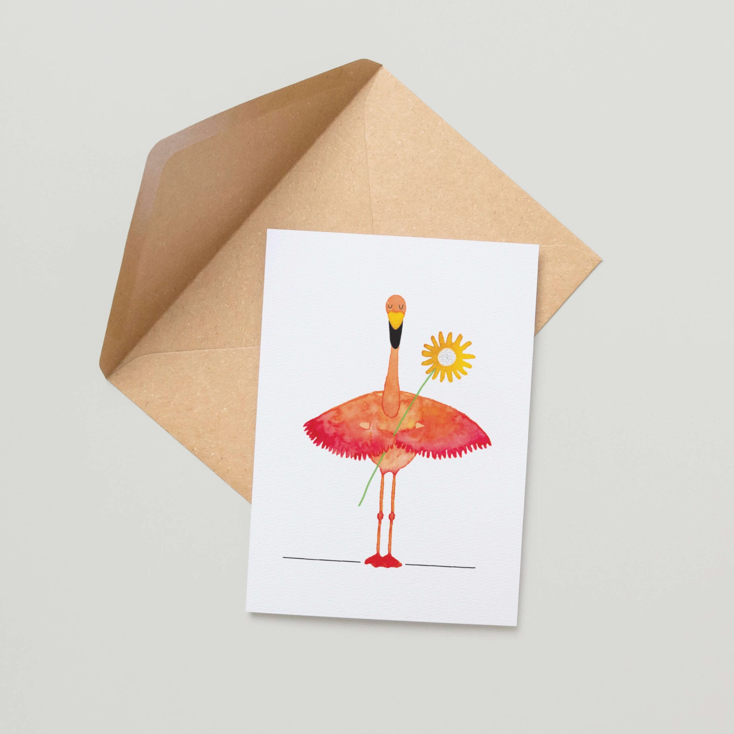 Een kaart met bloemen is altijd een goede keuze om iemand op te vrolijken, sterkte te wensen of zomaar een lief gebaar te maken. Deze wenskaart toont een handgetekende illustratie van een flamingo met een bloem onder de vleugel. Het is een wenskaart om iemand liefde, warmte of een bedankje toe te sturen.