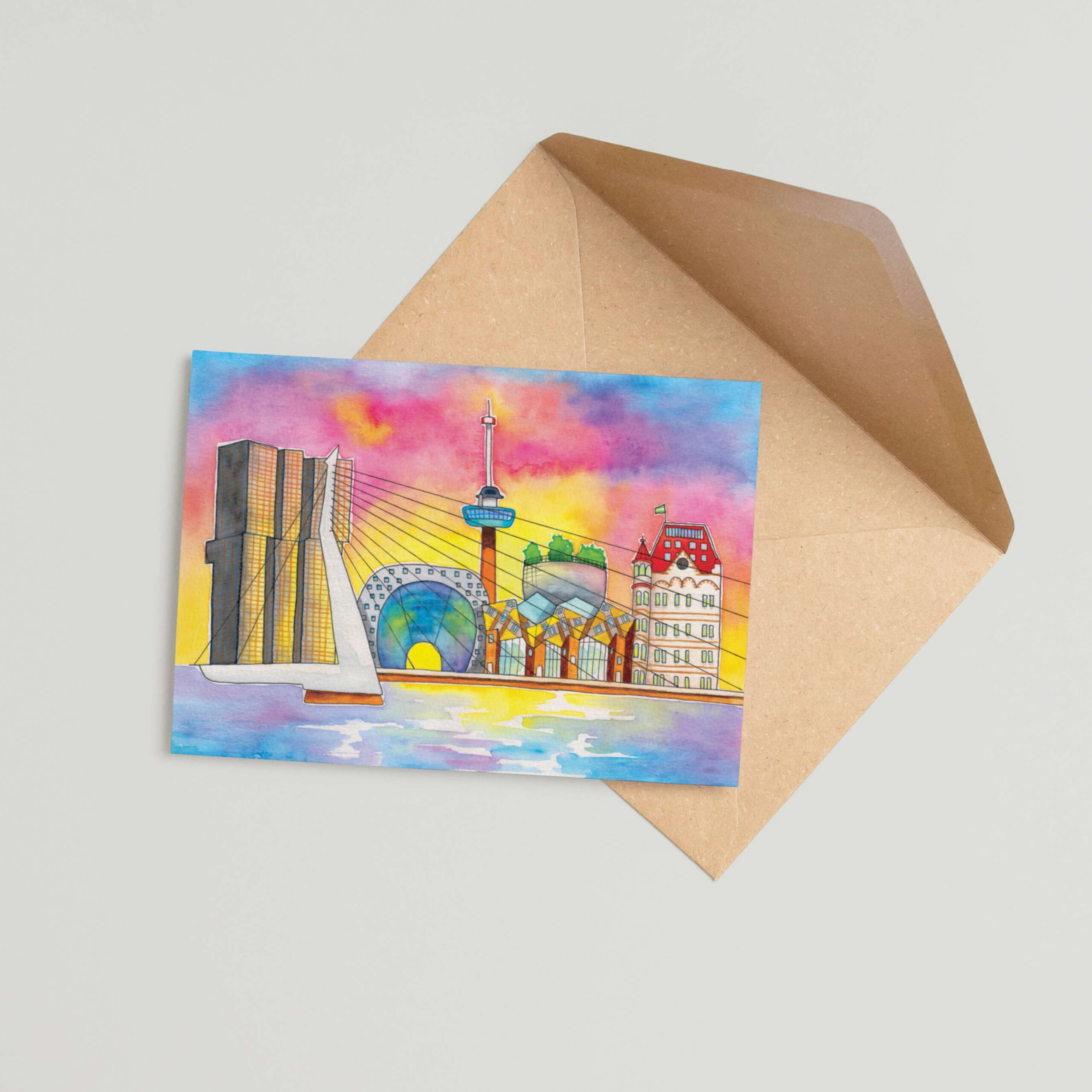 Deze wenskaart Rotterdam is erg leuk om te sturen bij een verhuizing, gewoon zomaar of als kunststukje. De herkenbare skyline maakt deze wenskaart Rotterdam niet alleen leuk om te versturen, maar ook mooi om te bewaren of in te lijsten als kleine herinnering aan de stad. De handgetekende stijl en aanwezige aquarelkleuren geven de illustratie een warme en persoonlijke uitstraling.