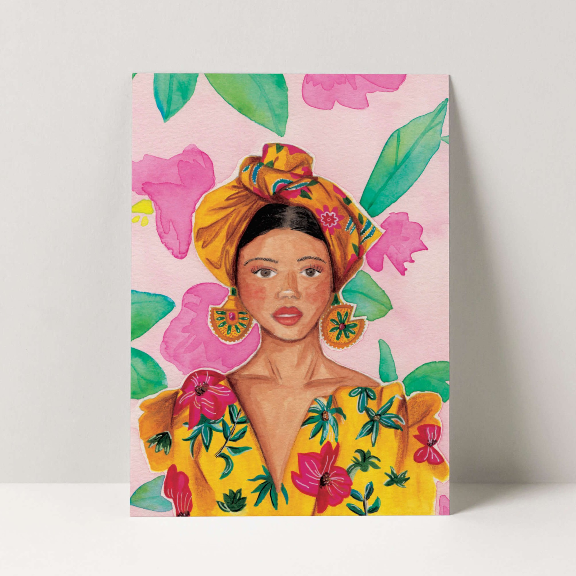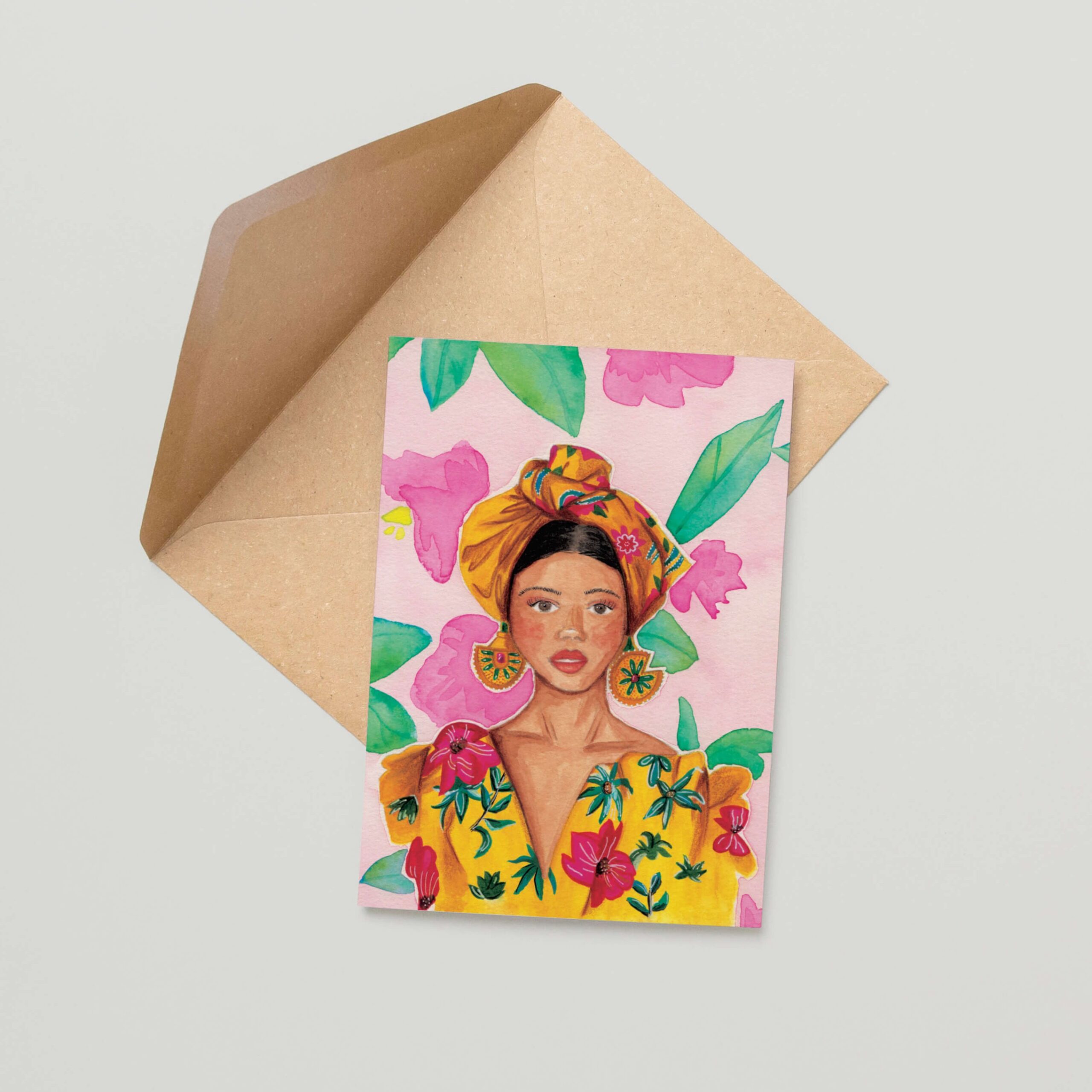 Tijdens één van onze reizen ontstond de inspiratie voor deze wenskaart. Nieuwe plekken, andere culturen en een overvloed aan kleuren zorgen altijd voor frisse ideeën. Dat gevoel heb ik gevangen in deze illustratie van een kleurrijke vrouw: krachtig, zacht en vol persoonlijkheid. Een stukje vrije tekenkunst dat is omgetoverd tot een wenskaart.